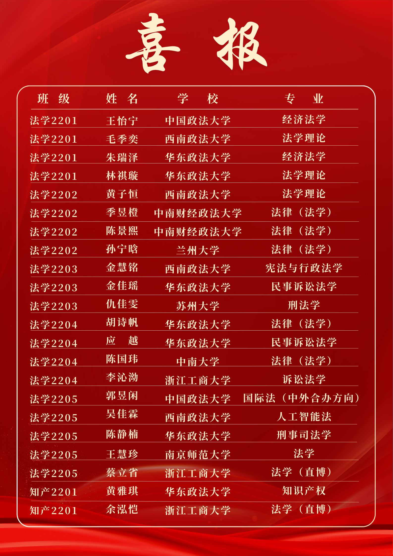 随着推免工作圆满收官,法学院再添捷报。截至目前,22名本科生已成功获得中国政法大学等知名学府的深造资格,为学院学风建设再添亮眼成果。在此,向同学们致以最热烈的祝贺!