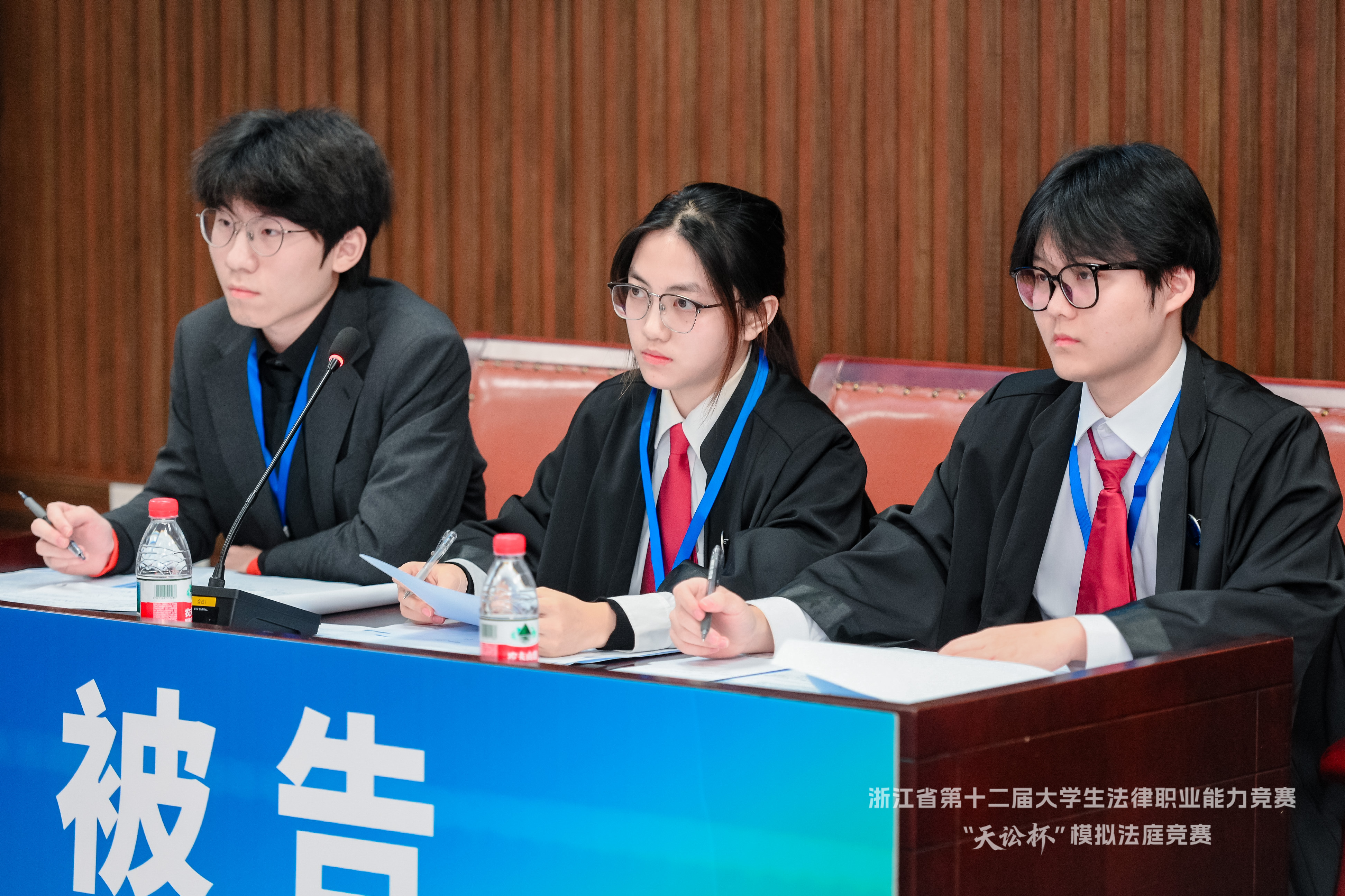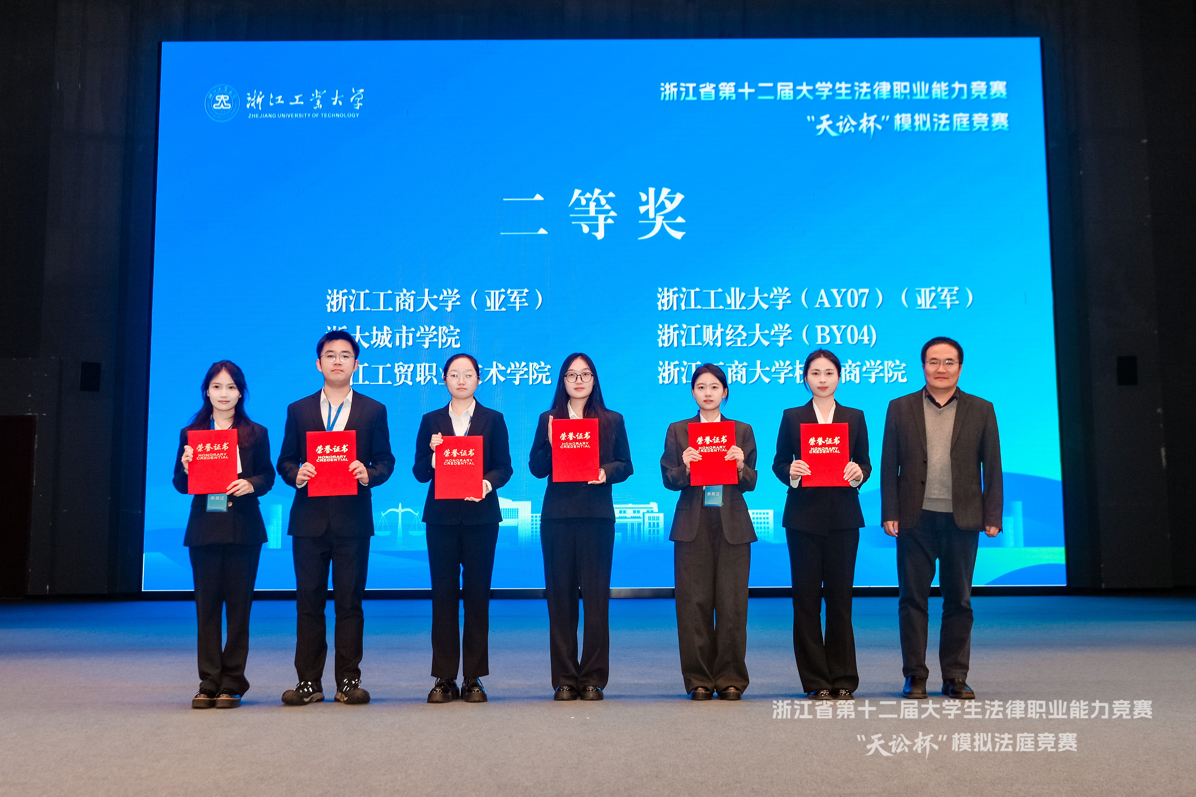 2025年11月22日至23日,浙江省第十二届大学生法律职业能力竞赛“天讼杯”模拟法庭竞赛在浙江工业大学圆满落幕。本次竞赛由浙江省大学生科技竞赛委员会主办,浙江工商大学、浙江工业大学承办,浙江天讼律师事务所协办,共有来自全省30所高校32支队伍的250名选手参赛,经过激烈角逐后4支队伍进入决赛,最终产生一等奖2项、二等奖6项、三等奖8项。我院参赛队伍成员表现优异,荣获二等奖(亚军)与最佳书状奖。同时,吕尚敏和黄文瀚两位老师荣获优秀指导教师奖。