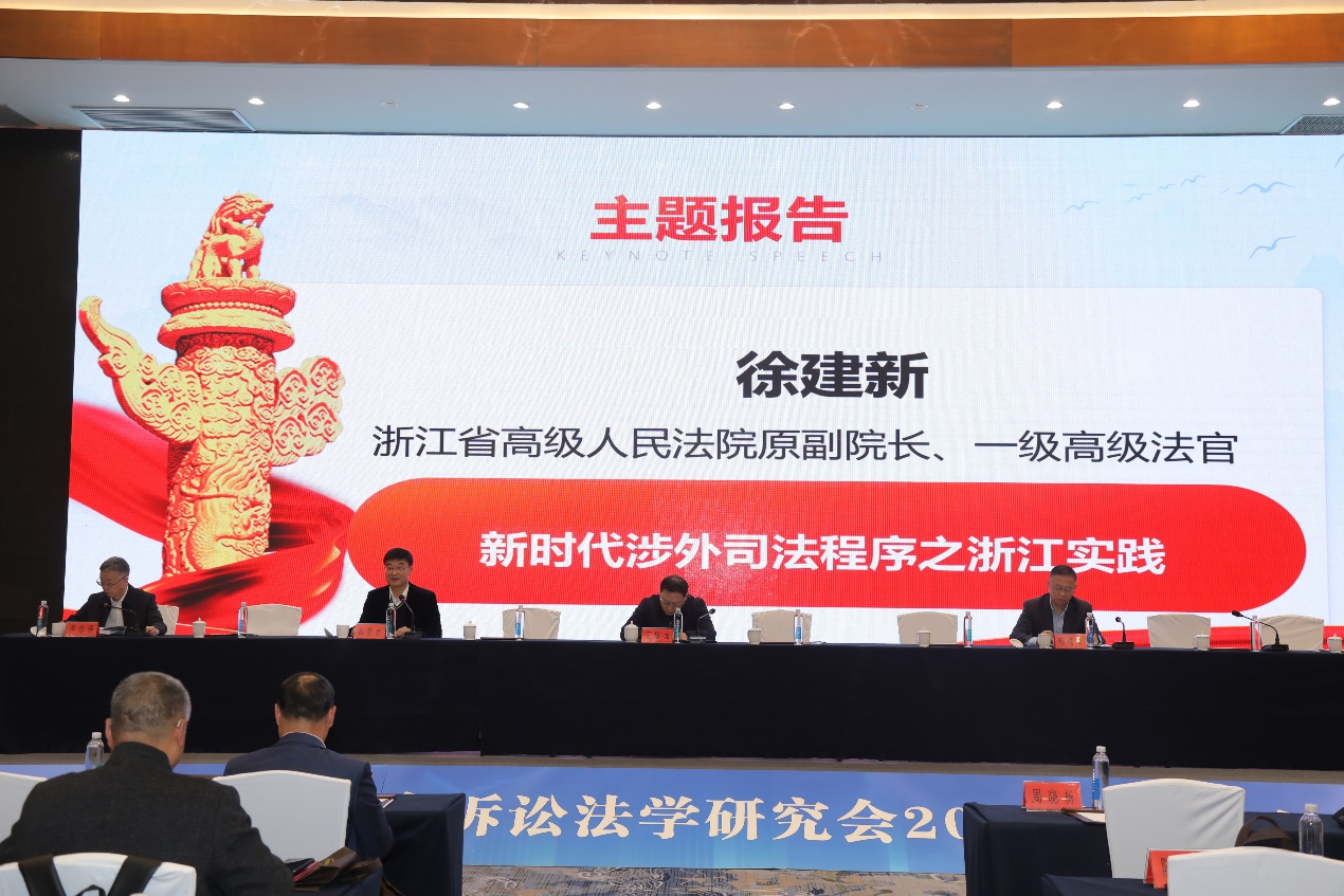 在主题报告环节,浙江省高级人民法院原副院长、一级高级法官徐建新作《新时代涉外司法程序之浙江实践》的专题分享。他系统介绍了涉外法治的内涵、国家顶层设计及浙江在涉外司法方面的创新举措。涉外法治是以法治思维和手段处理涉外事务的法律体系与实践,根本目的是维护国家利益、推动国际法治进步。近年来,我国出台多部涉外法律并加入多项国际公约,涉外法治体系日益完善。浙江作为开放型经济大省,高度重视涉外法治建设,通过优化涉外管辖权布局、设立国际商事法庭、推动多元解纷机制、建设“一站式”数字平台等举措,着力打造国际商事海事纠纷解决“优选地”。浙江法院积极发布双语典型案例,多项案例被联合国贸法会收录,展现了较高的司法公信力与国际影响力。他通过典型案例阐释了浙江在管辖权行使、国际调解、外国判决承认与执行等方面的实践探索,彰显了浙江涉外司法在服务高水平开放中的积极作用。